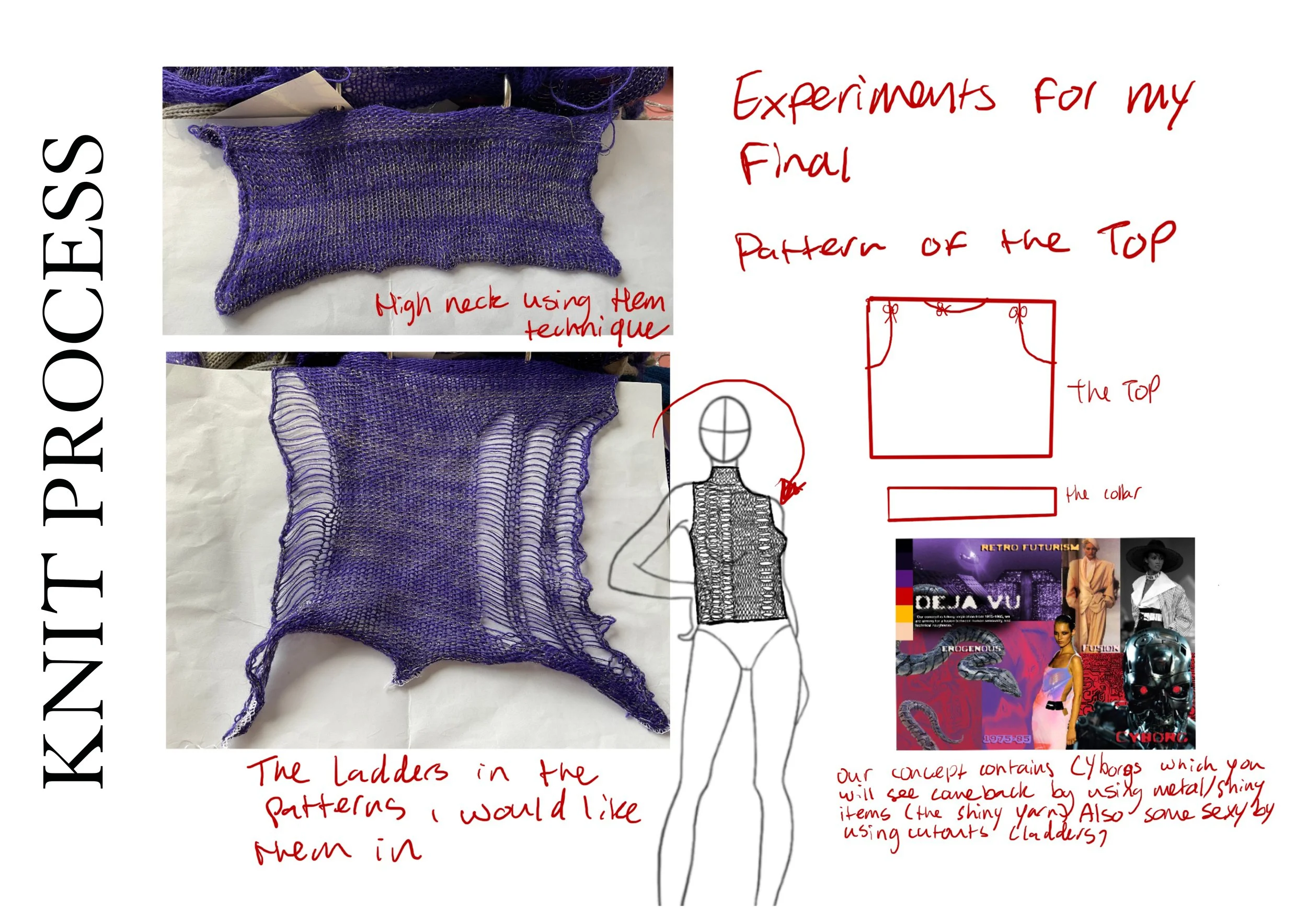 For the knitted top I wanted to bring back the metallic that the rest of the outfit was missing. So I did many different trials and ended up choosing a laddering technique in combination with a purple and silver yarn. Because I used 2 yarns at once, it created some unexpected lines in the knit, but I ended up really liking it and made the top seem more dimensional as well.