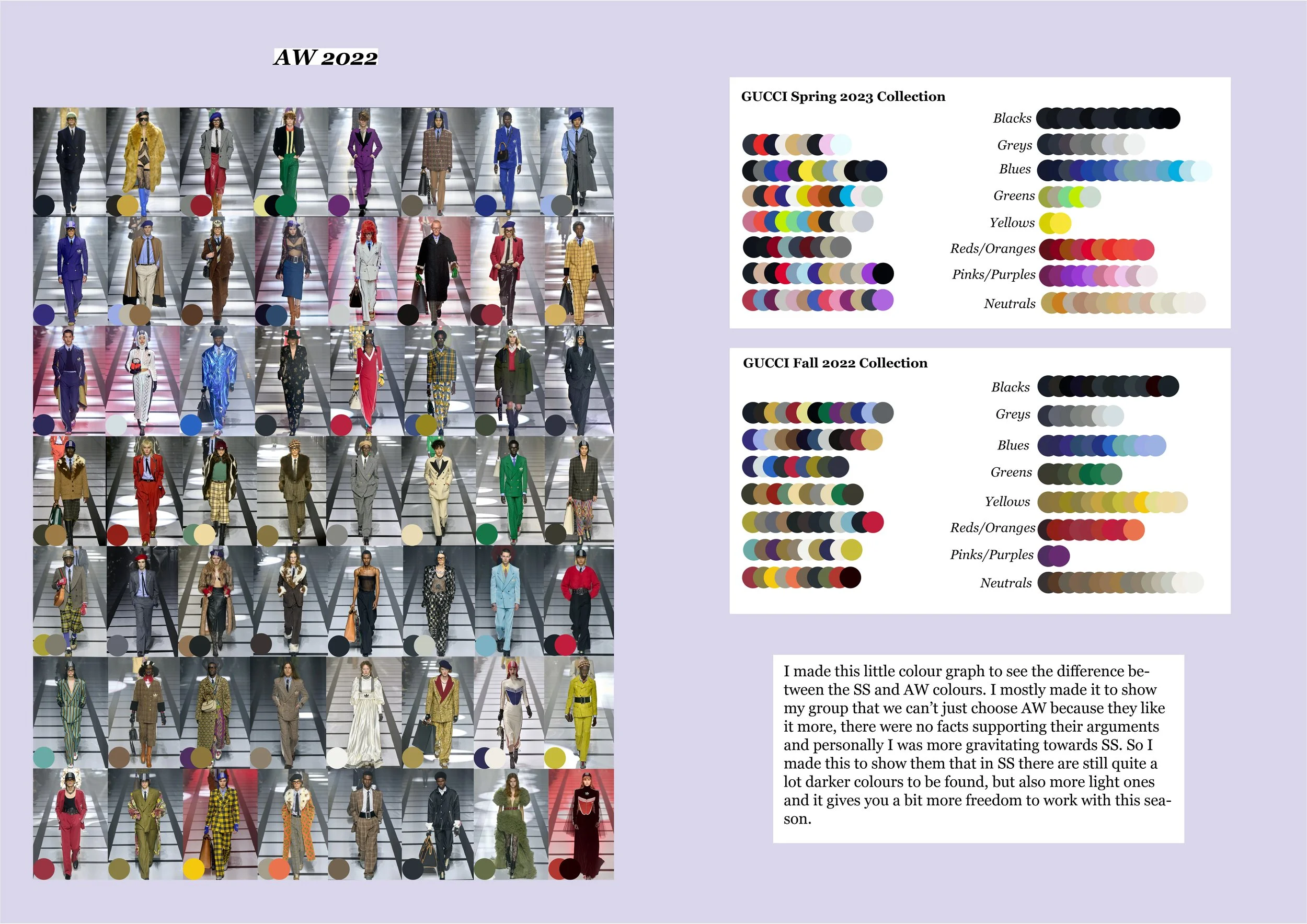 I researched what type of knits GUCCI has used in their collections and what colours they mostly used for which season. Based off this information we were able to look at the similarities and differences and see how GUCCI creates a cohesive collection per season.