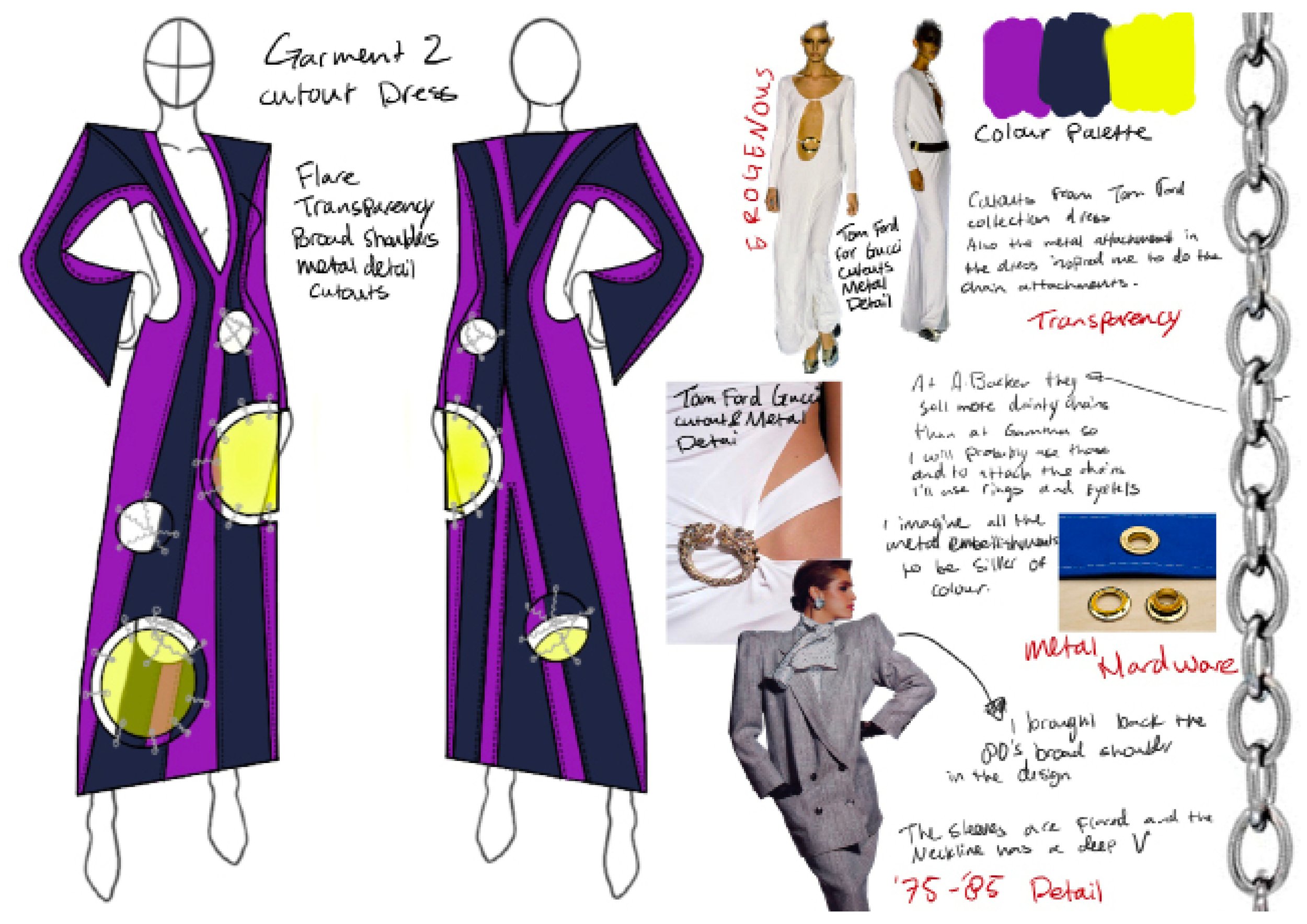 Here I really experimented with fitted silhouettes and how the cutouts would influence the drape of the garment. It was really challenging to work with the fake leather, because it was so thin and stretchy, but I did learn a lot from it.