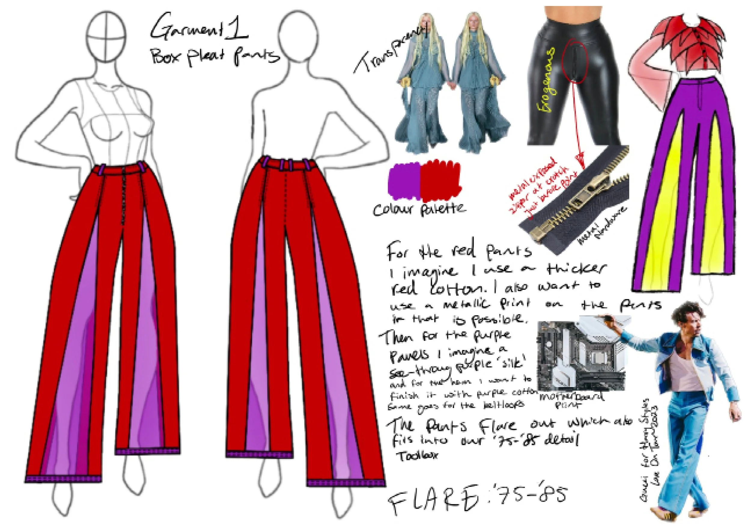For the pants I was mostly inspired by 70’s bell bottoms, flared pants. I combined this with the toolbox elements, adding a zipper that goes all the way down the crotch.